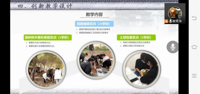 第二部分,翟老師介紹了課程的教學創新設計。從調研省内高校風景園林工程實踐課的問題着手,提出了四個問題。一是實踐項目單一,以繪制施工圖為主。二是缺乏實操性。三是教學成果與企業需求脫節。四是教學評價的局限性。基于這些問題,在我們開設這門課時,就要更加注重它的實用性、創新性、可操作性和科技性。我們的課程一定要讓學生在真實的項目、真實的環境中去操作。因此,提出了“兩個傳承、兩個引進、兩個創新”的教學理念以及“專業技能+四育”的教學特色。通過風景園林工程訓練強調“實踐是檢驗真理的唯一标準”,通過工程實踐檢驗設計方案的科學性和合理性,通過傳承中國的造園技藝,宣傳“大國工匠精神”,培養學生們的愛國主義情操,體現“課程思政”。工程訓練課最大的特點是現場實操,這體現了勞動教育。風景園林本身就是一門追求美的學科,在施工中我們要将“美”體現在每一處園林風景中。這裡我們将美育融入其中,在施工的過程中,教導學生不能偷工減料、以次充好,要嚴把質量關,培養學生精益求精的職業道德品質。結合習主席提出的“綠水青山就是金山銀山”的生态理念,将其融入到實訓項目中;結合教育部提出的建設“新工科”、“建設中國金課”、打造“一流課程”等理念,以及學校的現狀進一步改進和完善課程内容,從而确定了适合本校學生的三項實訓内容,即園路鋪裝、園林樹木整形修剪、土球包裝。采用了采用現場講解及示範結合現代信息技術的教學方法。在教學評價階段,每個實訓項目完成後我們都會進行小組自評,分享經驗、遇到的問題及解決辦法。再進行小組間的互評,最後教師再進行點評和總結。課程的最終成績是由學生在實訓中的表現、完成度、成果質量、實訓報告撰寫情況等綜合做出得分,再由各項目所占的比例累加得分。
