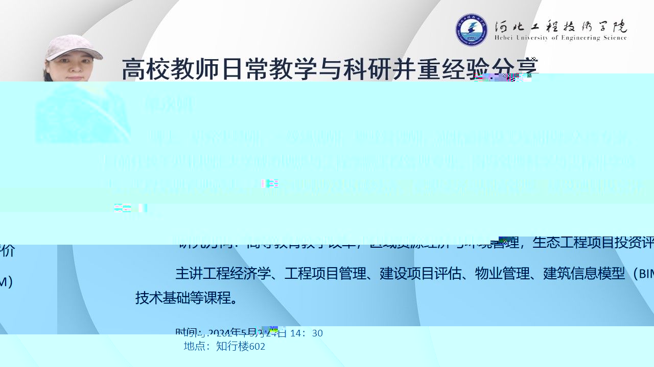 主講人簡介: 單永娟 博士,研究生導師,一級建造師,物業管理師,河北省建設工程招投标入庫專家。目前任教于河北地質大學城市地質與工程學院工程管理專業,指導管理科學與工程科學碩士、工程管理專業碩士,研究領域涉及區域經濟、資源經濟與環境管理、建設項目投資評價等。
